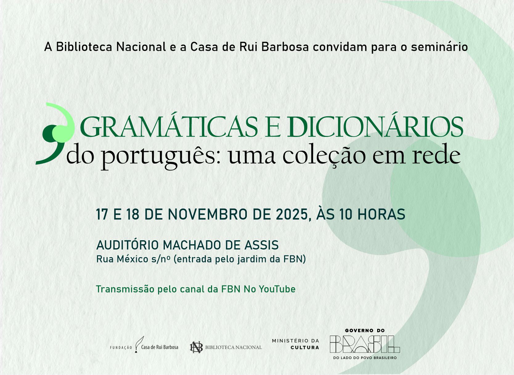 O seminário “Gramáticas e dicionários em português – uma coleção em rede” realiza-se, nos próximos dias 17 e 18 de novembro, a partir das 10h, no Auditório Machado de Assis da Biblioteca Nacional, localizada no centro do Rio. O evento gratuito será transmitido ao vivo através do canal de YouTube da instituição.