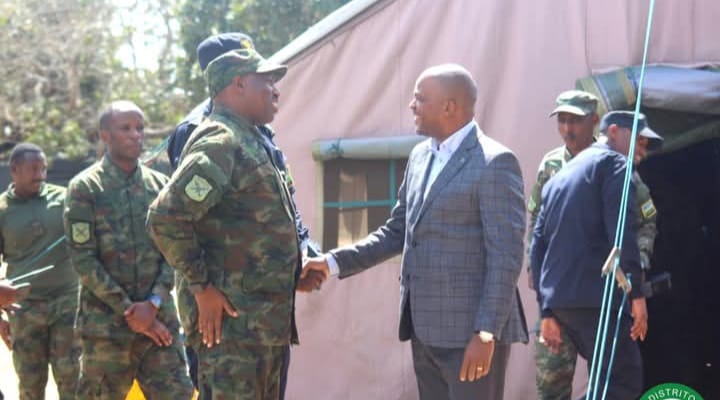 O administrador do distrito de Ancuabe, em Cabo Delgado, Belmiro Casimiro, visitou na sexta-feira (17) o quartel das Forças de Defesa do Ruanda, localizado na aldeia de Nacololo.