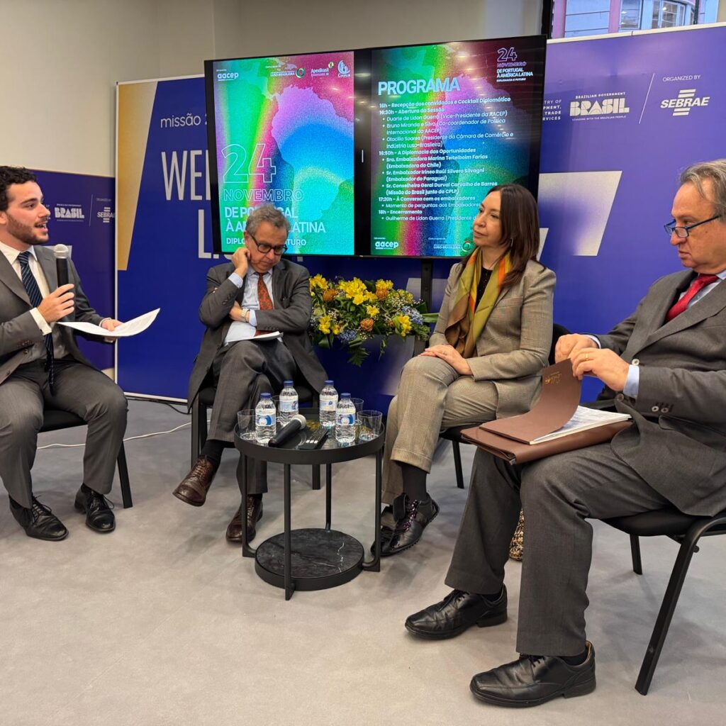 “De Portugal à América Latina” foi o nome da iniciativa realizada dia 24 de novembro, em Lisboa, numa organização da Associação Académica de Ciências Económicas e Políticas (AACEP), e com o apoio da Câmara de Comércio e Indústria Luso-Brasileira (CCILB), da Agência Brasileira de Promoção de Exportações e Investimentos (APEX Brasil) e da Cooperativa de Habitação e Construção (Cooplar CRL). O encontro integrou o programa “Diplomacia e Futuro: à conversa com Embaixadores”, reunindo representantes diplomáticos de vários países latino-americanos.
